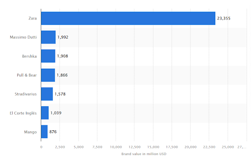 Zara is just one of the brands owned by Inditex, a global fashion corporation that’s also behind Pull&Bear, Massimo Dutti, Stradivarius and several others. Yet Zara tops them all as the leading Spanish fashion brand by far, with a value of more than $23 billion in 2021.