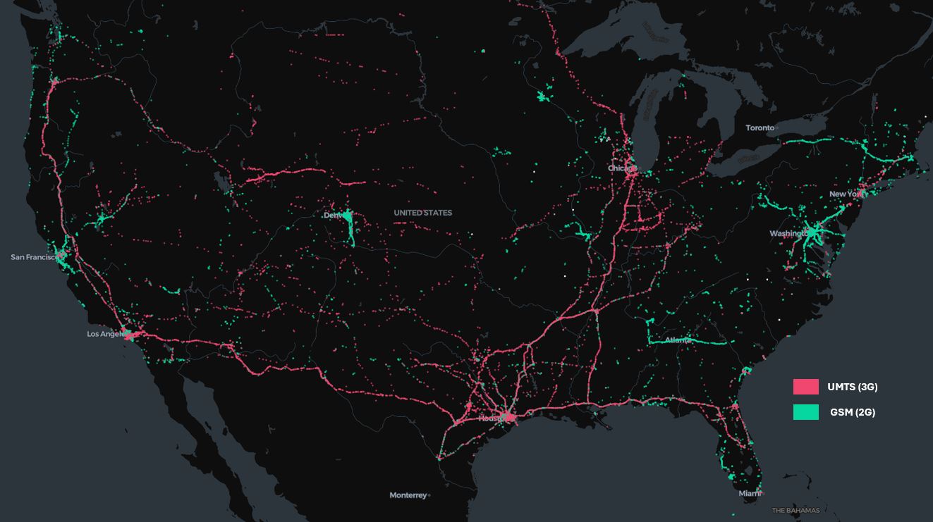 The map of 2G and 3G mobile antennas is more scattered, and also largely follows America’s interstate freeway system.